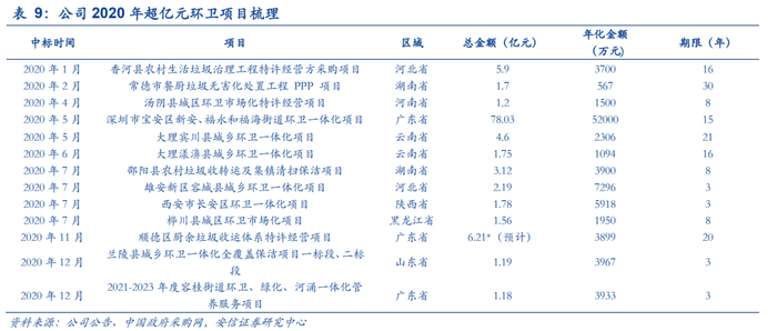 环卫市场化空间巨大,城市管家“呼之欲出”。自十八大提出深化改革推广政府购买服务以来,环卫市场化订单释放保持了稳定增速,新增环卫市场化项目金额达到2000亿。值得注意的是,物业公司正强势涌入环卫领域。此外,环卫一体化推动大型化订单频现,市政公共服务整合成为趋势。2020年便出现了两个超过70亿的环卫一体化PPP项目:深圳市宝安区新桥和沙井街道环卫一体化PPP项目以及宝安区新安、福永和福海街道环卫一体化PPP项目。展望十四五,环卫市场化持续推进趋势逻辑不改。根据环境司南,截止12月中旬,公司2020年度中标各类环卫运营类项目接近50个,全年中标项目年化总额超过12亿、合同金额高达130亿,稳居行业第一。