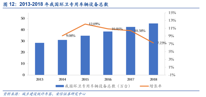 根据城乡建设统计年鉴数据,从2013-2018年我国环卫专用车辆设备总数大幅提升,2014-2018年年度增高分别为9.08%、12.9%、10.85%、10.38%和7.23%。随着垃圾分类政策的不断深入,未来环卫车板块仍有一定发展空间。