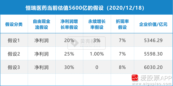 截至2020年12月18日,恒瑞医药收盘价位105.66元,总市值约为5600亿。根据自由现金流折现公式,①自由现金流;②净利润增长率;③永续增长率;④折现率这四个变量的取值不同,企业价值也会不一样。