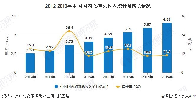 根据中国文化和旅游部统计数据显示,2012-2018年我国旅游业总规模实现稳步增长,旅游产业正在成为经济增长的重要引擎;2012年旅游总收入为2.59万亿元,2018年中国国内旅游总收入为5.97万亿元。2019年,全年实现旅游总收入6.63万亿元,同比增长11.1%。