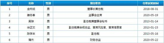 协会信息显示,川财证券现任主要高管仅有六位:金树成先生“一肩挑”董事长和总裁两大要职;三名副总裁中的两名“身兼多职”;财务总监和监事会主席则并非业务方向。