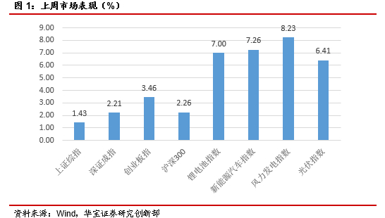 上周(12月14日-12月18日)上证指数上涨1.43%,深证成指上涨2.21%,创业板指上涨3.46%,沪深300上涨2.26%,动力电池指数上涨7.00%,新能源汽车指数上涨7.26%,风力发电指数上涨8.23%,光伏指数上涨6.41%,新能源所有版块表现均优于大盘。