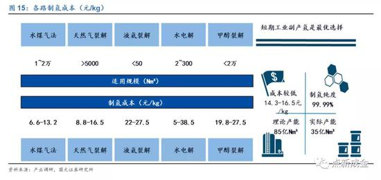 当下燃料电池汽车规模较小,主要制氢依靠工业副产氢,制氢成本14.3-16.5元/kg;随着燃料电池车规模的提升,天然气/煤制氢可以提供大规模、低成本的氢气供应(6.6-16.5元/kg);未来弃风弃光电解制氢将成为最洁净环保的能源利用方式,电解水制氢成本与电价高低密切相关。