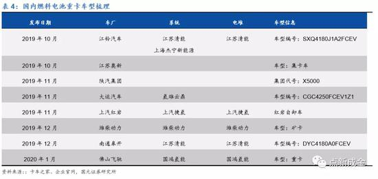 奖补政策鼓励车型朝大功率与重载方向发展。根据燃料电池汽车城市群示范目标和积分评价体系,对于货车和客车来说,功率和载重越大,对应的国家奖励金额则越多。以2020年积分标准测算,50kW车型,奖励13万/辆,80kW&12吨车型奖励22.9万/辆,110kW&25吨+车型奖励47.3万/辆,110kW&31吨+车型奖励54.6万;假设地补1:1的话,则50kW总补贴26万;80kW&12吨总补贴45.8万;110kW&25吨+总补贴车94.6万;110kW&31吨+总补贴车109.2万。一方面燃料电池适用于重载领域,另一方面奖补政策的鼓励进一步刺激产业链企业向燃料电池重卡方向发展,我们预计未来燃料电池主要应用车型将是重卡。