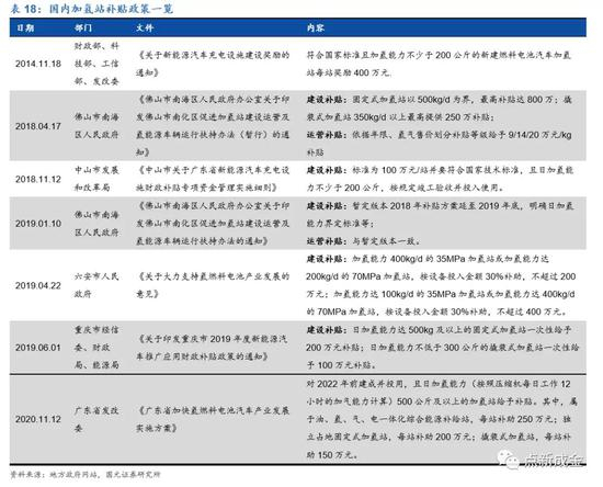 从政策上看,加氢基础设施滞后制约氢能产业发展的问题得到国家地方政府的重视,车站协同,适度超前的建站思路成为政企共识。2019年3月,国务院首次将推动加氢设施建设纳入《政府工作报告》,为加氢站建设注入强心剂。部分氢能先行区明确出台优厚建设运营补贴方案,切实降低加氢站建运资金壁垒。2014年11月,财政部、科技部、工信部、发改委曾联合出台加氢站建设补贴方案,对日加注200kg站点奖励400万元。随2015年底补贴有效期截止,国内加氢站建设进入补贴空窗期。2019年成为国内地补政策的转折点,国内氢能产业先行区地方补贴政策密集出台,截止2019年底,国内佛山、六安、重庆等市均已明确加氢站补贴方案,综合考量建设方式、加注能力、建设投运时点等因素。佛山等地还将根据氢气售价水平提供运营补贴,从初始投资和运营回报两方面缩短加氢站回报周期。