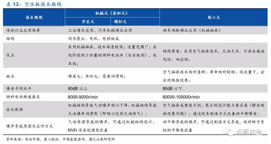 燃料电池空压机领域主流技术路线分别是机械式(罗茨式、螺杆式)和离心式,离心式空压机又分机械轴承与空气轴承两种方案。