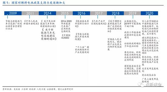 中国对于燃料电池发展支持处于循序渐进状态,我国从 2001 年就确立了“863 计划电动汽车重大专项”项目,确定三纵三横战略,以纯电动、混合电动和燃料电池汽车为三纵,以多能源动力总成控制、驱动电机和动力蓄电池为三横。近期随着燃料电池产业发展逐渐成熟,中国在燃料电池领域的规划纲要和战略定调已经出现苗头,支持力度逐渐加大。
