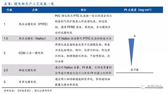 催化剂是燃料电池的关键材料之一,其作用促进氢、氧在电极上的氧化还原过程。目前最好的催化剂仍是Pt和Pt基催化剂,当前铂金用量已经降至可接受水平,根据DOE数据,2015年Pt含量达到0.16g/kw,质量比活性大于0.5A/mg。目前,本田FCV和丰田二代Mirai燃料电池催化剂Pt含量降至0.12g/kw。
