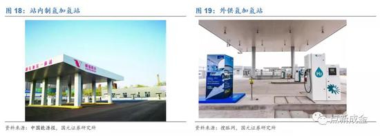 2)固定式加氢站:与普通加油站形式类似,加氢站设备需在现场安装固定,设备分散分布,占地面积大,加氢噪声小,通常固定式加氢站储氢量及日加注能力大于移动式加氢站。早期国内固定式加氢站多数专门提供氢气加注功能,近年来中石化、中石油加入加氢网络构建进程,将原有加油站改建为油氢合建站,2019年新建成佛山樟坑、浙江嘉兴、上海西上海、安智共4座加油加氢合建站,提供了传统能源供应企业利用原有能源补给网络建设加氢站的可行方案。除油氢合建站外,油气氢电综合供能站也是针对未来车辆能源多样化供应的合理方案,2019年建成油气氢电综合供能站1座,在建1座。