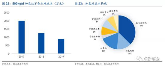 伴随加氢站设备国产化率提升,加氢站设备成本不断下降,三年降幅超过50%。2017年500kg/d加氢站不含土地建设成本2000万元左右;目前500kg/d加氢站不含土地建设成本在800~1000万区间,其中设备成本占比超过80%,安装建设费用约占20%。加氢站核心设备中,配套500kg级加氢站用氢气压缩机售价约合300万上下,占比约40%,加氢机单台约70~80万元,占比20%,储氢瓶组/储氢罐约占16%,三部分设备合计占比超过80%。(注:各加氢站配置压缩机、加氢机、储氢瓶方案存异,成本构成不尽相同)。