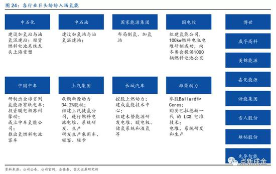 能源巨头中,中石化建设油氢混建站,投资燃料电池系统龙头企业上海重塑,中石油、浙能集团布局加氢站,国电投成立氢能公司切入中游电堆产业链,国家能源集团布局制氢和加氢领域。汽车零部件巨头中,发动机巨头潍柴动力收购Ballard和Ceres股权,购买Ballard电堆技术;康明斯收购Hydrogenics;零部企业佛吉亚和米其林合资成立氢燃料电池公司,博世设立氢燃料电池研发中心。具备副产氢的化工企业也积极进取氢能,国内嘉化能源、滨化股份、鸿达兴业和东华能源等企业均在布局制氢和加氢领域。
