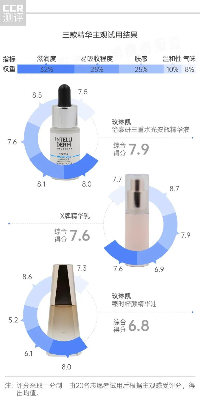 试用结果显示,20名志愿者对玫琳凯两款安瓶精华液、精华油的滋润度较为满意,平均得分为8.0分,且认为精华油产品相较精华乳而言更适合秋冬使用。