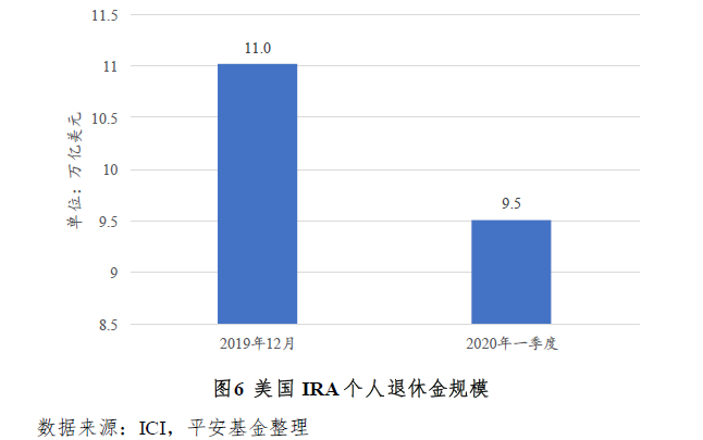 IRA是美国个人退休金账户(Individual Retirement Account)的简称,其创设依据是1974年颁布的《雇员退休收入保障法》(ERISA)。IRA 是一种个人自愿投资性退休账户,主要用于投资人退休后的养老用途。个人退休金账户属于享有延税(Tax Deferred)优惠的个人长期储蓄养老账户,允许个人在该账户内存入限定额度的资金,直到退休后提取资金时才缴纳相应的所得税。自1974年开设以来个人退休金帐户已深入美国家庭,成为美国私人退休金市场上与401(K)计划并驾齐驱的退休产品。个人退休金帐户经营管理模式既与证券公司的经纪业务相似,又具有开立银行帐户和保险品种的一些特点。截至2019年底,IRA资产规模达到11万亿美元,占整个退休市场总规模的1/3左右。目前大约1/3的美国居民拥有IRA账户,IRA中共同基金占比达到44%。