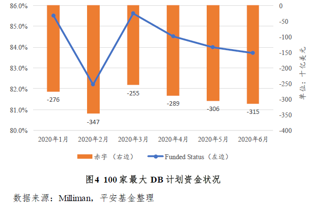 在评价第二支柱DB型养老金计划运作情况中有一个非常重要的指标称为“Funded Status”,用来衡量DB计划的资产和负债情况。Funded Status 为DB计划的总资产与总负债的比例,如果该比例小于1,表明该DB计划是处于资不抵债的状况。新冠肺炎疫情期间,美国股市波动巨大(见图3)。根据Milliman 发布的养老金运作指数(见图4),全美前100家最大的私营部门DB型养老金计划平均Funded Status随着标普500的下跌,在2月份也出现了明显的滑落。从1月份的85.5%降到2月份的82.2%,赤字也从1月份的2460亿美元增加到2月份的3470亿美元。虽然3月份以来美国股市回暖,对DB养老金的资产端是个利好因素,但是美联储几次紧急降息,导致DB养老金计算负债的贴现利率下跌,对养老金计划的负债端形成了很大的压力。3月以来Funded Status趋势逐渐平稳,但还是低于疫情前的平均水平。
