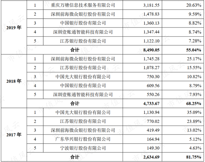 另外,微众银行、江苏银行(600919.SH)连续三年都在前五大客户中,中国银行(601988.SH)(03988.HK)、光大银行(601818.SH)(06818.HK)、平安旗下的金融壹账通(OCFT.N)有两年在前五大客户中,大客户的稳定性还不错。