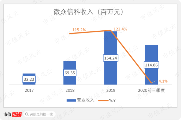 2019年,微众信科的收入为1.54亿元。2017-2019年,公司收入的CAGR达到118.8%,远快于市场整体增速。