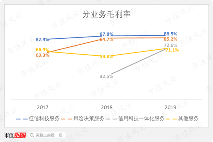 分业务看,征信科技服务的毛利率最高,2019年达到88.5%;风险决策服务毛利率达到85.2%,与之接近;信用科技一体化毛利率稍低,只有72.6%,不过趋势上正在上升;其他服务附加值相对较低,毛利率也只有71.1%。