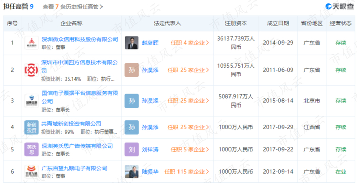 通过天眼查可以发现,孙淏添目前还担任着另外5家公司的高管。其中,中润四方是微众信科的控股股东,共青城新创投资是一家投资公司,英沃思广告传媒目前还没有实质业务(参保人数0)。