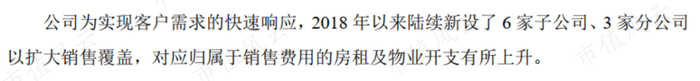 一方面,公司为了实现对客户需求的快速相应,2018年以来陆续开设了6家子公司、3家分公司,相应的销售人员数量也大幅增加。
