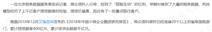 根据一篇第三方的报道,微众信科由于入行早,抢到了“银税互动”的红利,使得风控模型经受了大量检验,授信价值高。