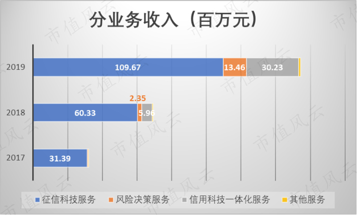 2019年,征信科技服务贡献了1.10亿的收入,占到总营收的71.1%,是最主要的收入来源,其次是信用科技一体化服务的3023万元和风险决策服务的1346万元。