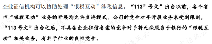 而在2019年11月,政府出台了113号文,规定了税银非直连要逐步切换为直连,也就是说税务数据不能直接推送给第三方公司。