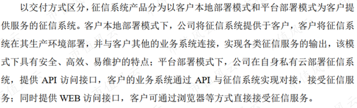 按照报告交付方式的不同,微众信科的征信科技产品分为平台和本地部署两种。区别在于,本地模式下征信系统部署在客户的生产环境,平台模式下部署在公司自身的私有云,客户通过API接口或者WEB接口访问。