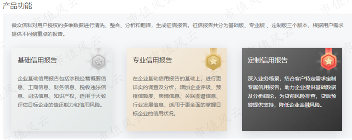 除了基础版的报告外,微众信科还有详细分析版、专业定制版的企业征信报告。