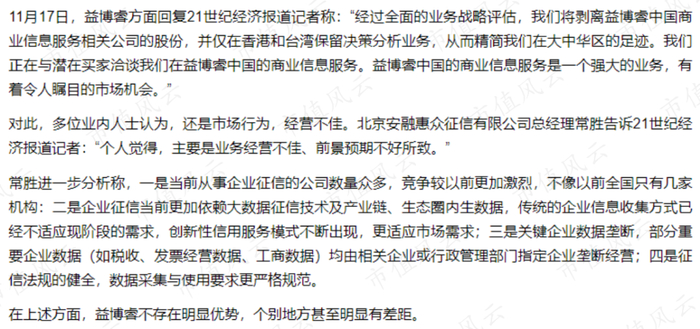 (来源:21财经,国际征信巨头益博睿退出中国大陆计划,业界分析:市场行为)