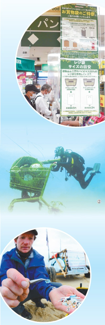 图①:日本东京一家超市内悬挂着购物塑料袋收费的海报,呼吁顾客自备购物袋前来消费。