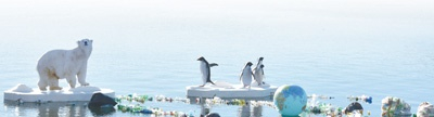 在克罗地亚海滨城市希贝尼克展出的极地动物模型和塑料垃圾布景,旨在提醒人们关注全球变暖和塑料污染问题。