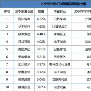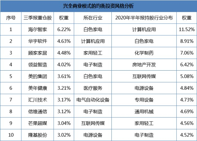 均衡风格基金的典型代表是乔迁的兴全商业模式(163415)。从2020年三季报来看,其前十大重仓涵盖8大行业,仅白色家电与电子制造略有偏向。从2020年半年报披露的所有持股情况看,除计算机应用与白色家电的所占权重稍大之外,其余各行业的投资权重占比均保持在5%左右。