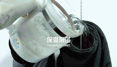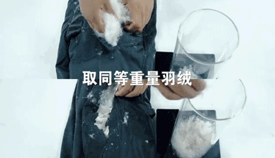 用蓬松度500PF的羽绒裤和这条羽绒裤,分别裹住两个水杯,倒入相同温度的水,看保温效果。