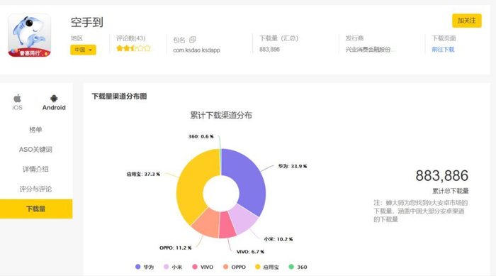 公开资料显示,2016年6月,兴业消金曾与杭州行健金融服务外包有限公司合作推出线上贷款产品“布丁小贷”,目前该产品已在各大应用市场下架。随后,2017年6月兴业消金旗下“空手到”APP上线,据APP关键词大数据分析平台蝉大师数据,截至目前,其在安卓应用市场下载量仅88万,苹果应用市场评论量仅435条,远低于同行水平。再之后则是前文所述小鲨易贷的“短暂辉煌”时代。
