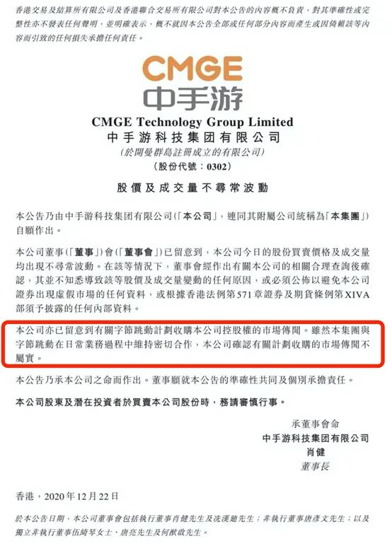 12月22日晚间,中手游在港交所公告,本公司今日的股份买卖价格及成交量均出现不寻常波动。在该等情况下,董事会经作出有关本公司的相关合理查询后确认,其并不知悉导致该等股价及成交量变动的任何原因。本公司亦已留意到有关字节跳动计划收购本公司控股权的市场传闻。虽然本集团与字节跳动在日常业务过程中维持密切合作,本公司确认有关计划收购的市场传闻不属实。