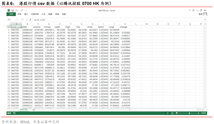 将原始港股行情数据保存为上图形式,即每只股票存成一个csv文件,文件名为股票代码,文件夹命名为hk_data。数据从2008年初至2020年11月末,共计3739只股票(含权证,含已退市)。每个csv文件内部如下图所示。