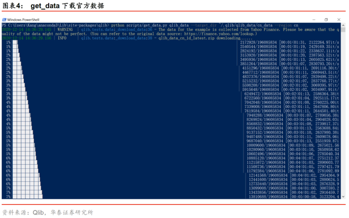 Qlib提供A股和美股两类数据作学习测试使用。Qlib官方给出的A股数据下载方法为:在Qlib安装路径(如C:/Users/username/anaconda3/Lib/site-packages/qlib)启动命令行,运行如下get_data指令: