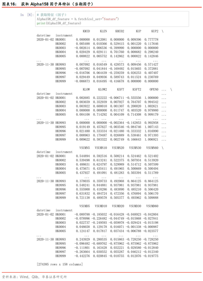 执行上述指令后,程序将计算从start_time至end_time的当期因子值和下期收益,分别作为后续AI模型训练的特征和标签。在笔者运行环境下(CPU:Intel i5-8265U @ 1.60GHz;RAM:16.0GB),生成2020年1~11月港股日频158个因子的时间开销约为695秒。下图展示生成Alpha158因子过程以及158个因子简称。以前两个因子KMID和KLEN为例,查看源码知,KMID=(close-open)/open,其含义为日内涨跌幅,KLEN=(high-low)/open,其含义为日内振幅。