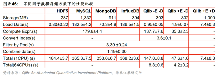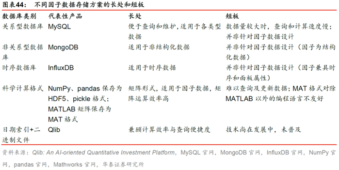 Qlib的设计初衷之一在于覆盖量化投资的全过程,为用户的AI算法提供高性能的底层基础架构,降低AI算法的使用门槛,便于金融从业者使用。Qlib的“高性能底层基础架构”体现在多项工程上的创新,例如数据存储方案、表达式引擎和缓存系统。据论文Qlib: An AI-oriented Quantitative Investment Platform测试显示,Qlib在读取原始数据和生成因子任务上的性能表现优于传统关系型数据库MySQL、非关系型数据库MongoDB、时序数据库InfluxDB和HDF5。