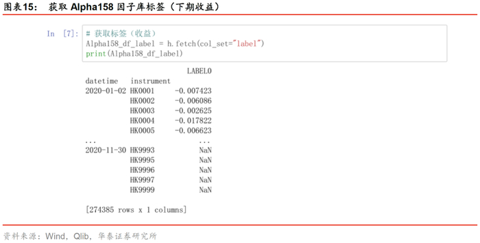 通过h.fetch(col_set=’label’)指令可获取标签。默认参数下,股票t日的标签对应t+2日收盘价相对于t+1日收盘价的涨跌幅,相当于t日收盘后发信号,t+1日收盘时刻开仓,t+2日收盘时刻平仓。如下图,2020年1月2日HK0001(长和;0001 HK)的标签值为-0.007423,对应2020年1月6日该股票涨跌幅为-0.7423%(2020年1月4~5日非交易日)。