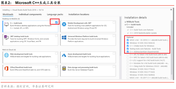 安装生成工具过程中,需要点选部分选项,参考微软官方建议链接及下图: