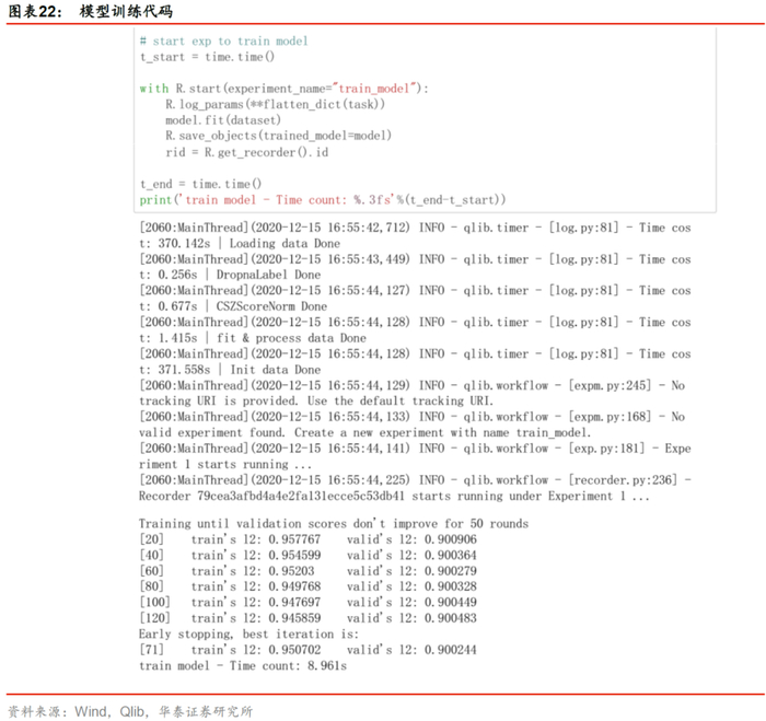 完成模型训练参数定义后,调用qlib.workflow模块正式进行训练,依次执行如下命令:qlib.workflow.start开启训练;model.fit拟合模型;qlib.workflow.save_objects保存模型;qlib.workflow.get_recorder().id获取“实验”(即模型训练)记录的编号。下图展示模型训练的代码实现过程。笔者运行环境下,读入数据及数据预处理时间开销约为372秒,训练模型时间开销约为9秒。LightGBM模型迭代的实质是参数优化,当验证集损失连续50轮未降低时停止迭代,此处迭代71次后结束训练。
