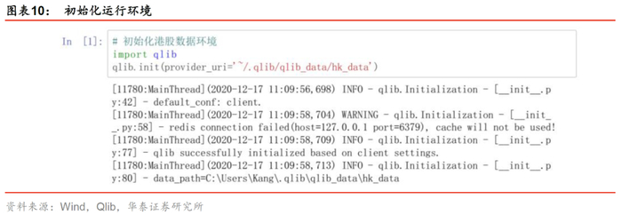 在Python中运行Qlib程序前,需要首先初始化运行环境,命令为qlib.init,参数provider_uri为港股数据所在路径,如下图所示。