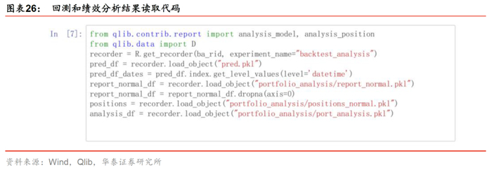回测代码实现如上图所示。调用qlib.workflow模块正式进行回测,依次执行如下命令:qlib.workflow.start开启回测;qlib.workflow.get_recorder获取此前模型训练“实验”记录;recorder.load_object读取模型;qlib.workflow.get_recorder初始化回测“实验”记录;qlib.workflow.record_temp.SignalRecord初始化调仓信号;sr.generate生成调仓信号;qlib.workflow.record_temp.PortAnaRecord初始化回测及绩效分析;par.generate生成回测及绩效分析结果。