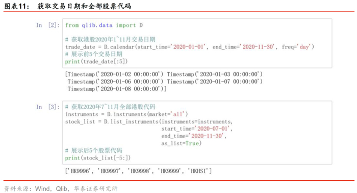调用qlib.data模块可读取原始数据。例如qlib.data.calendar命令可读取指定时间区间内交易日期;qlib.data.instruments命令可定义股票池,参数market=’all’代表选取全部个股构成股票池;qlib.data.list_instruments命令可以展示指定时间区间内的股票池,时间区间的意义在于,股票池可能会随时间动态变化,如指数成分股票池。