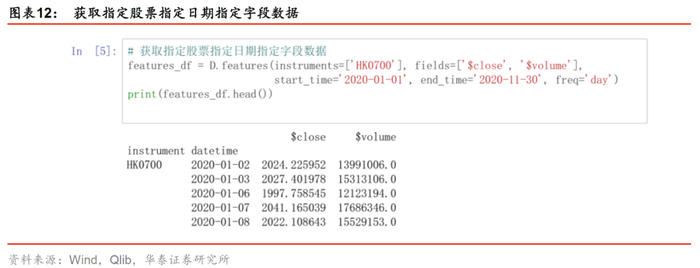 调用qlib.data.features模块可以获取指定股票指定日期指定字段数据,例如下图展示获取腾讯控股(0700 HK)在2020年1月初至11月底的日频后复权收盘价和成交量。需注意,Windows系统下Qlib安装路径以及数据文件默认在C盘,笔者的经验是读取数据的程序最好也在C盘下运行,否则获取feature时可能无响应。