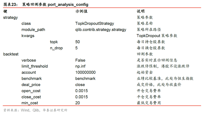 接下来设置策略回测参数port_analysis_config,该参数为字典类型,又可以分为strategy和backtest两个子键。第一项strategy为策略参数,例如此处使用TopkDropout策略,每日等权持有topk=50只股票,同时每日卖出持仓股票中最新预测收益最低的n_drop=5只股票,买入未持仓股票中最新预测收益最高的n_drop=5只股票。第二项backtest为回测参数,用于设置涨跌停限制、起始资金、业绩比较基准、成交价格、交易费率等信息。