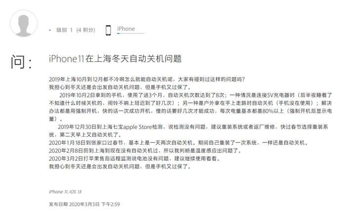 ▲多人反映苹果的产品在低温环境下出现自动关机、触屏失灵等故障(来源:苹果官方社区)