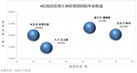 最后,我们用一张全球投资大师的投资年限和年化业绩图来结束今天的话题。