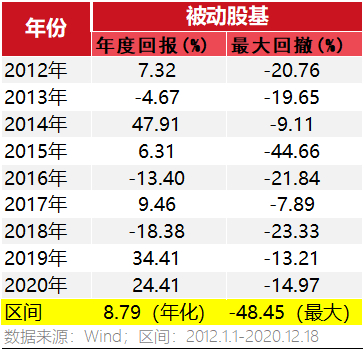 从下表可以看到,被动股基指数年度回报分布在-18.38%~47.91%之间,平均年化回报8.79%;年度回撤最高达-44.66%,近乎腰斩。